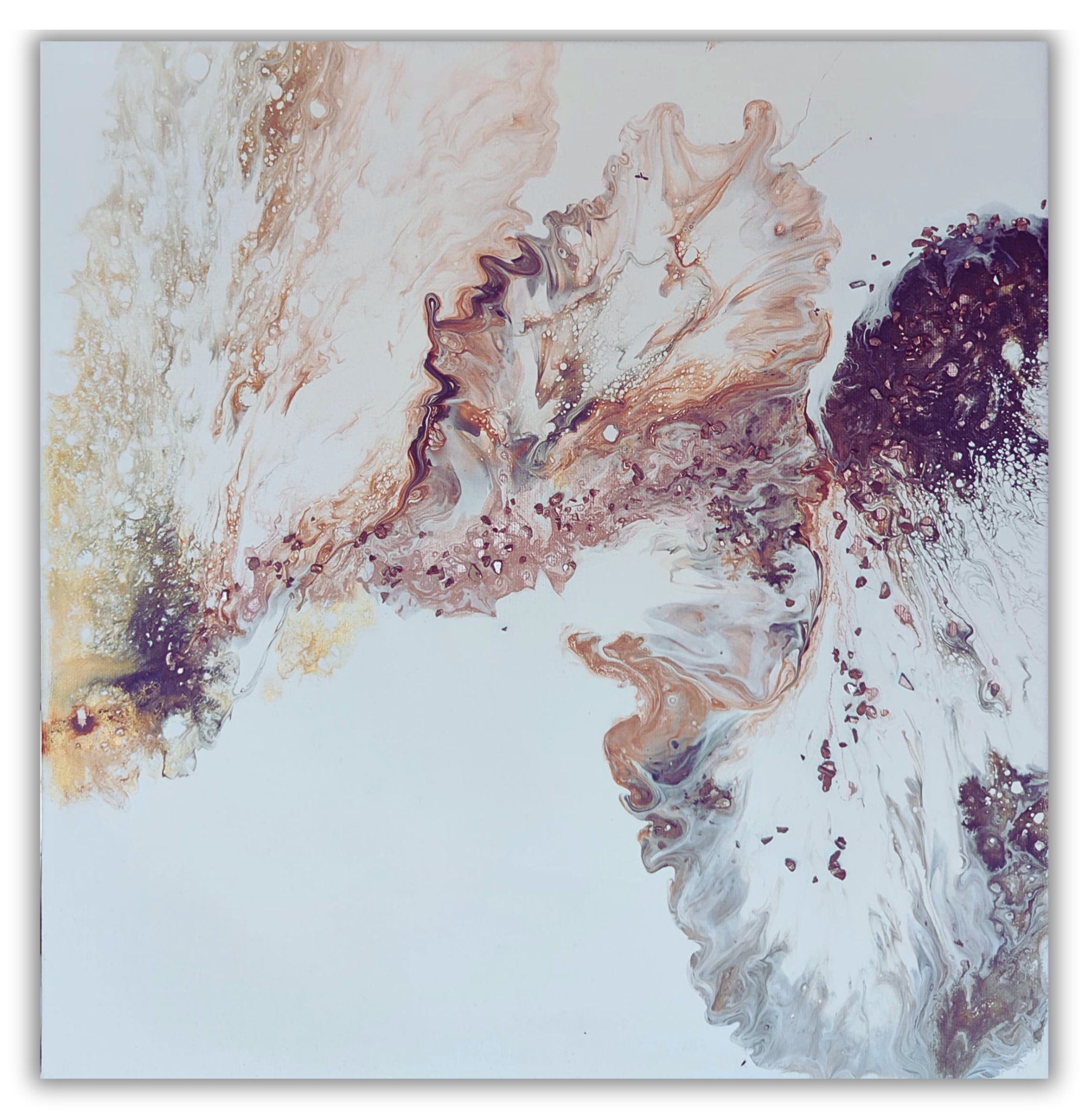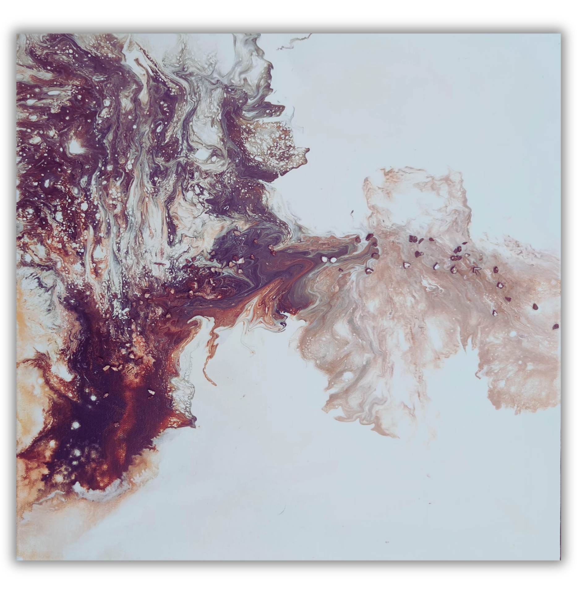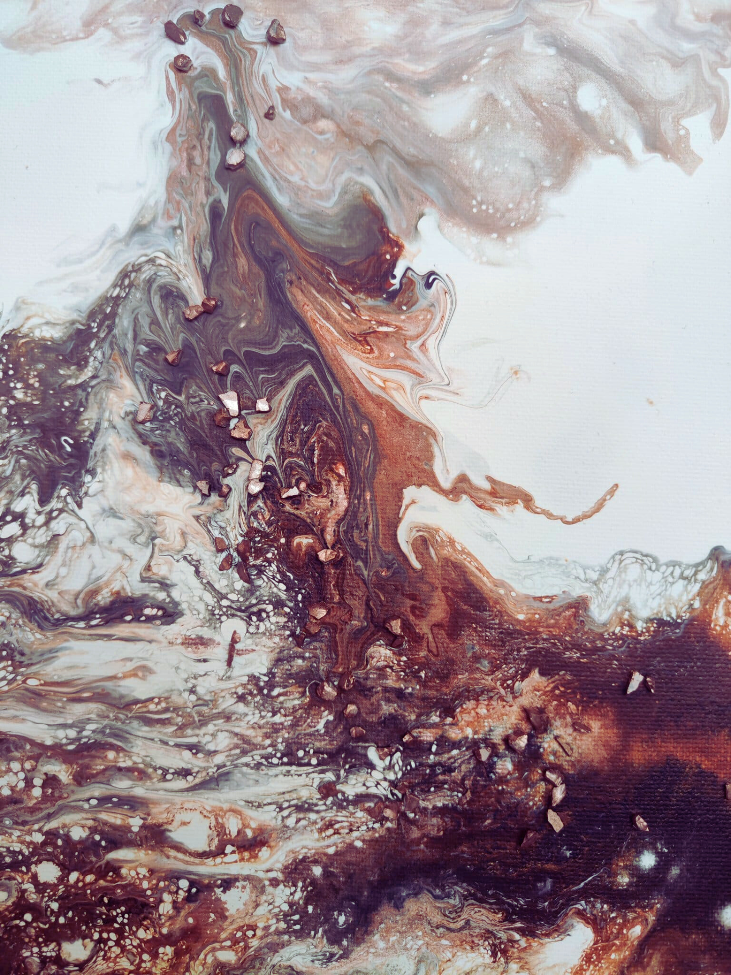 Tento živelný obraz pracuje s energií hnědé, černé a metalické zlaté. Strukturu a celkový dojem doplňují jemné dekorativní kamínky, které dodávají dílu na hloubce a dynamice.