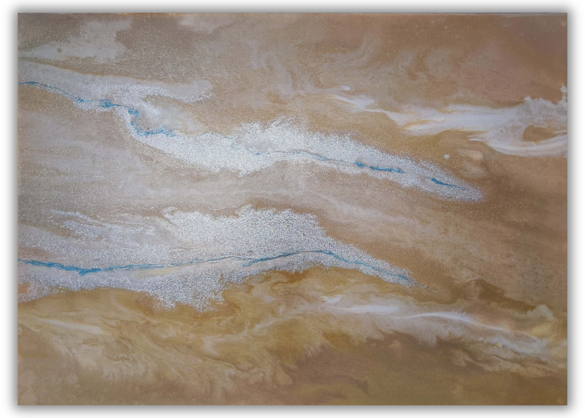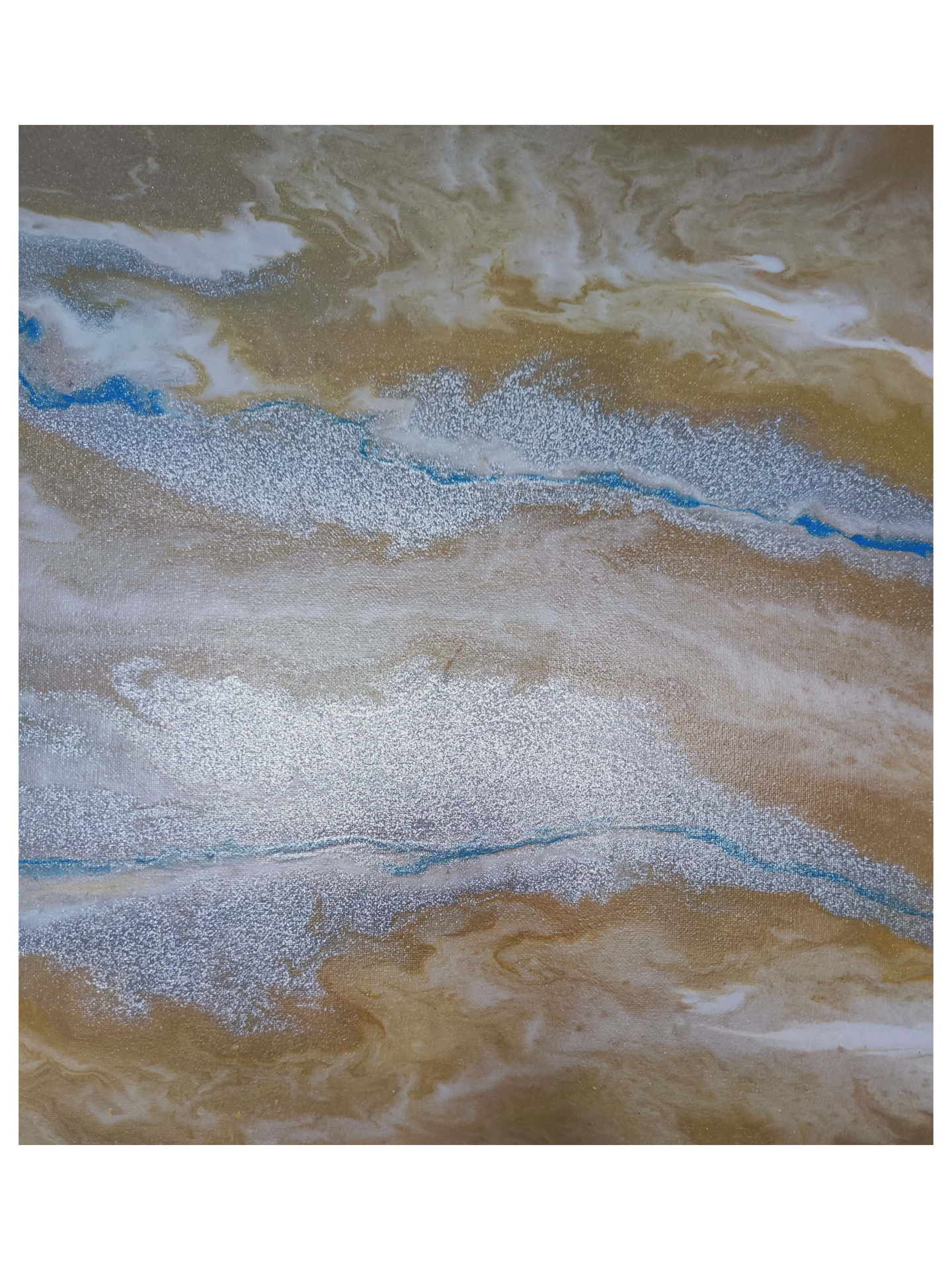 Dílo s názvem Onyx je inspirováno hloubkou a strukturou stejnojmenného kamene. Je laděno do teplých béžových, bílých a žlutých tónů, které doplňují stříbrné prvky a jemný detail modré barvy, dodávající kompozici hloubku a kontrast.