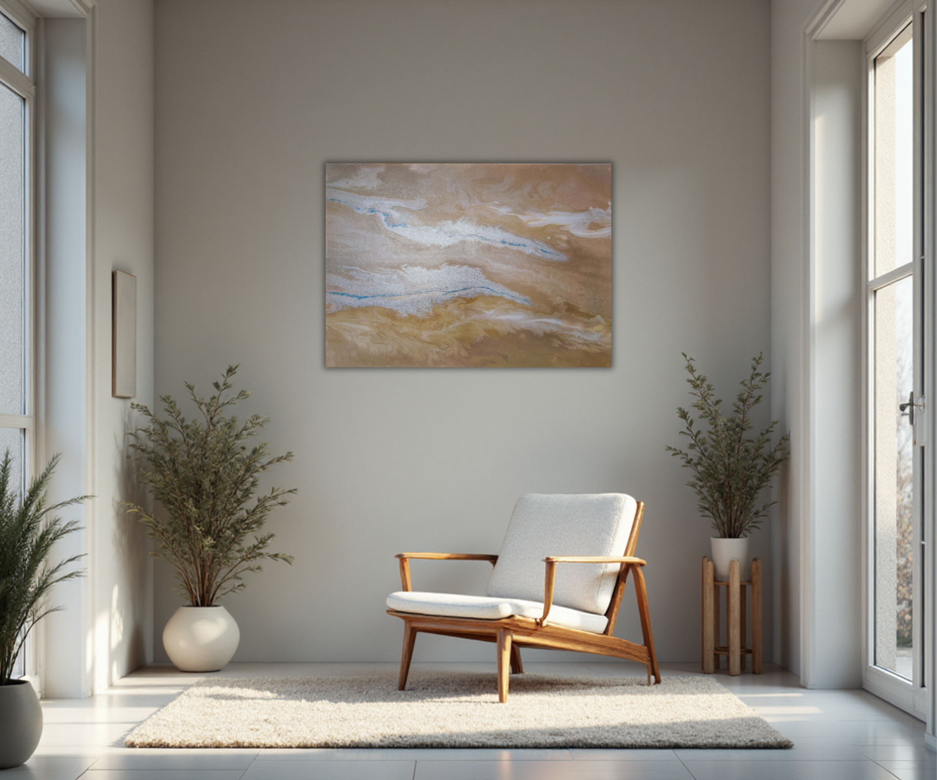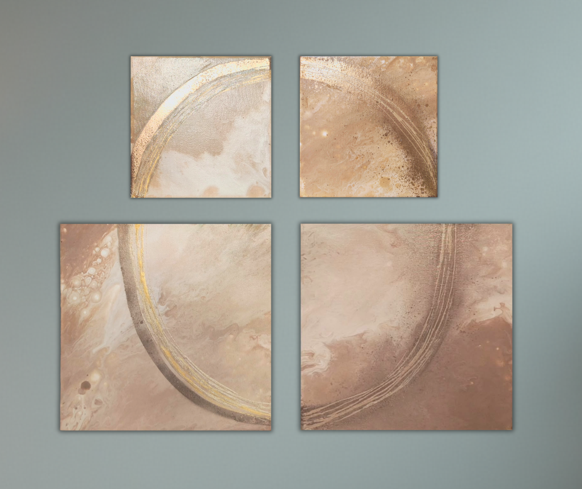 Cappuccino jako harmonie hnědé, krémové a zlaté. Akryl, plátna s rozměry 20 × 20 cm a 30 × 30 cm.