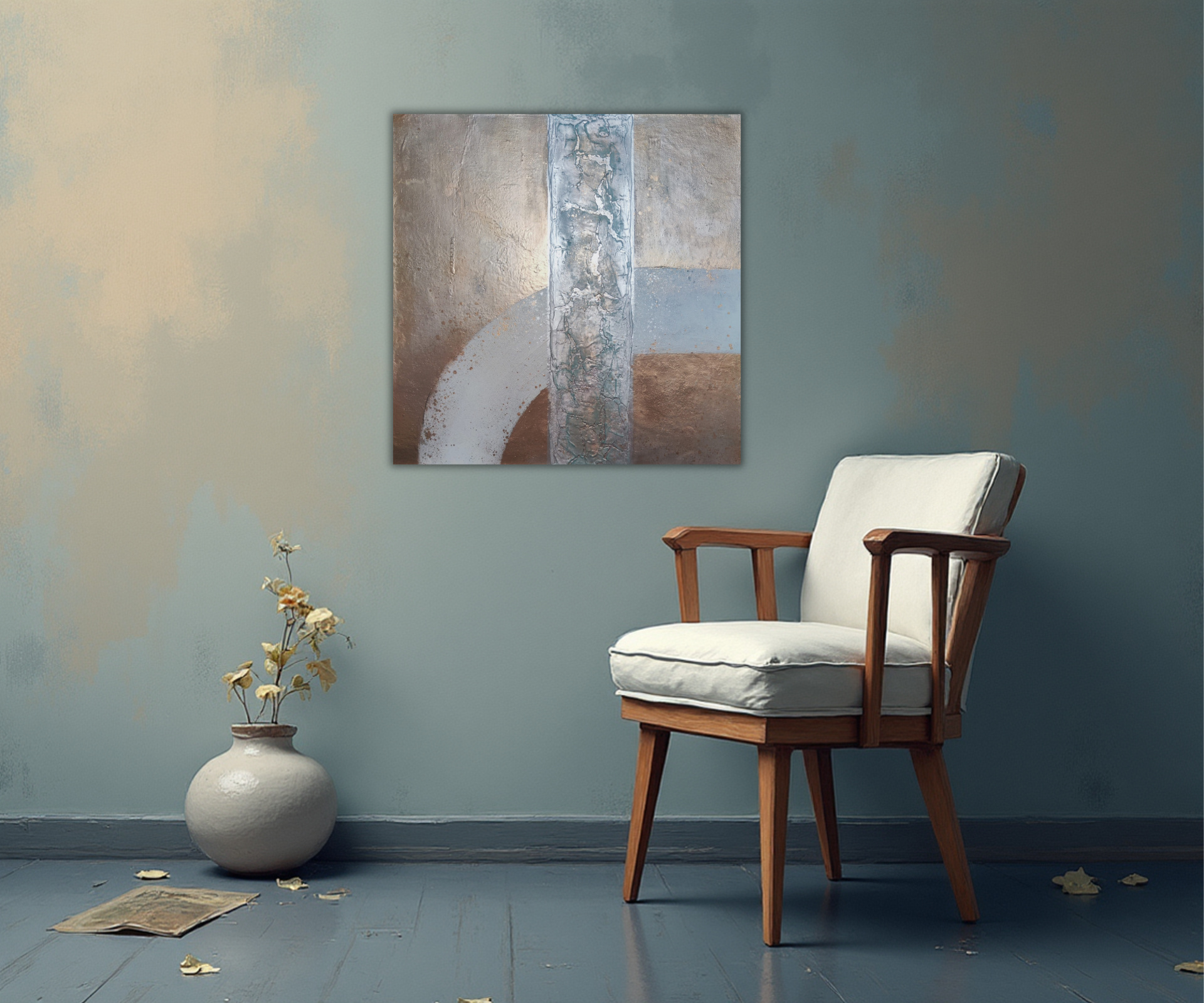Hra barev a kovového lesku. Akryl, plátno s rozměry 50 × 50 cm.
